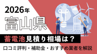 富山県 【2026年】富山県の蓄電池の見積もり相場はいくら?口コミ評判・補助金・おすすめ業者を解説! 富山県で蓄電池を導入すると、見積もりはいくらくらいが相場?補助金を使うと、費用はどのくらい変わるの? 富山県で家庭用蓄電池を導入する場合、7〜10kWhクラスで約120〜180万円前後が工事費込みの一般的な目安です。国のDR補助... 続きを読む 2026.03.09 富山県蓄電池