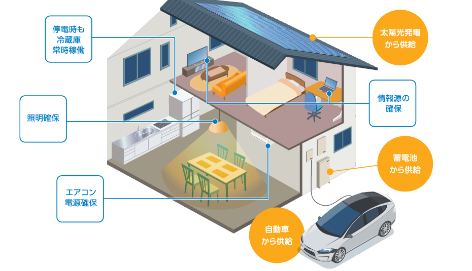 昼間は太陽光で発電した電力を家庭で使い、夜間は割安な深夜電力を蓄電して活用します。