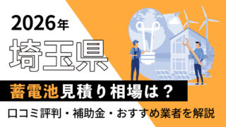 蓄電池 【2026年】埼玉県の蓄電池の見積もり相場はいくら?口コミ評判・補助金・おすすめ業者を解説! 埼玉県で蓄電池を導入したいけど、費用はどのくらいかかるの?補助金は使える?業者はどこに頼めばいいの? 埼玉県で蓄電池を導入する場合、費用目安は総額80万円〜220万円前後です。容量や工事条件によって変わるため、まずは複数社から見... 続きを読む 2026.02.19 蓄電池