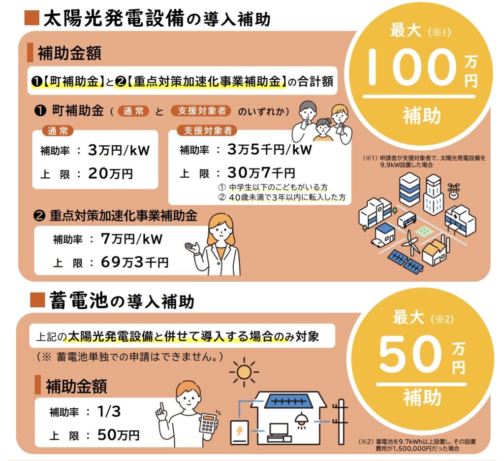 - 太陽光発電:町補助金+重点対策加速化事業補助金で最大100万円
